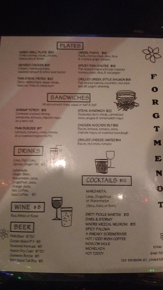 Customers rave about the delicious food and great pricing at Forget Me Not. Dishes like the steak frites with chimichurri sauce and thin, crispy fries are a crowd favorite. The watermelon margarita is a perfect complement to the flavorful meals served here.
