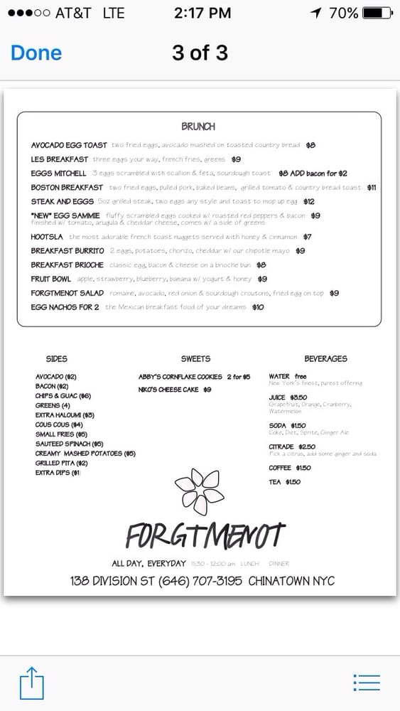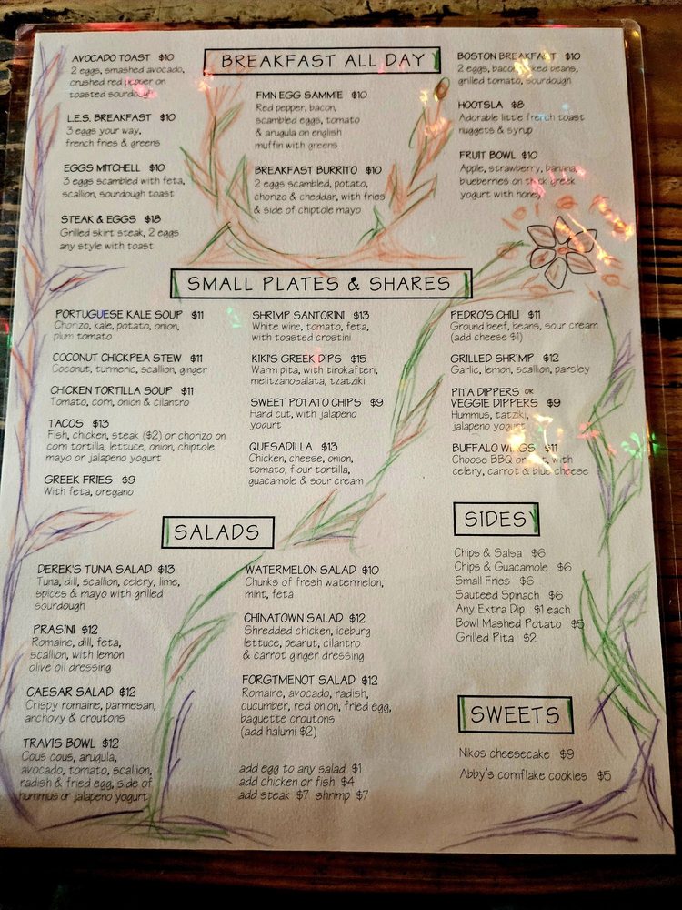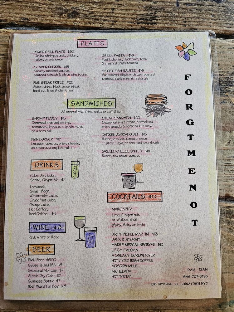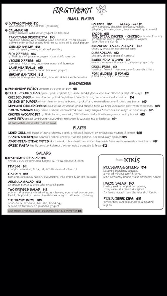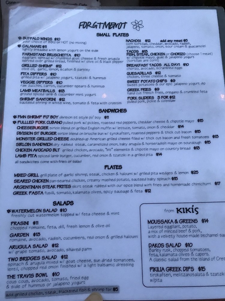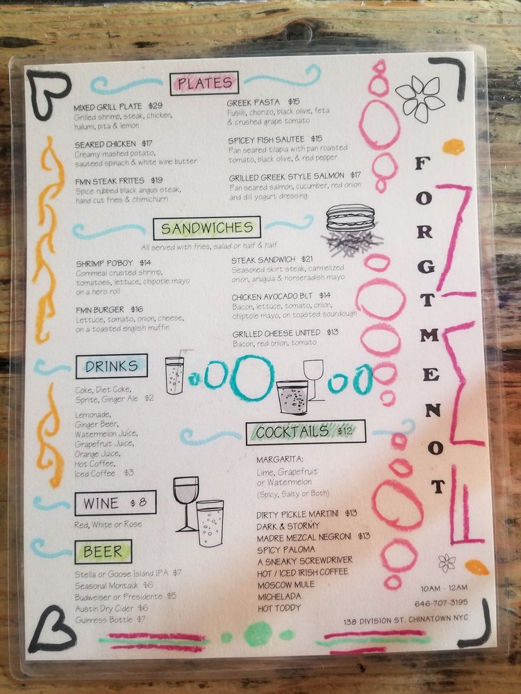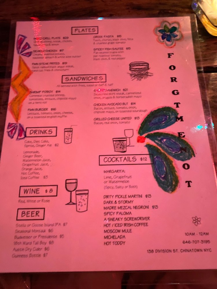 Forget Me Not is a vibrant American bar located in New York, offering a diverse menu with options for vegetarians and enticing dishes like the 2 Bridges Salad, Boston Breakfast Brunch, and Avocado Egg Toast. The laid-back atmosphere, complete with outdoor seating and a pool table, creates a welcoming and relaxed vibe for guests. Customers praise the friendly staff and delicious cocktails, like the watermelon margarita, paired with mouth-watering dishes such as the steak frites and Breakfast Burrito. The menu showcases a fusion of flavors and ingredients, making it a go-to spot for brunch, lunch, and dinner. Whether you're looking for a casual meal or a fun night out, Forget Me Not promises a memorable dining experience with top-notch service and a hipster, intimate setting.